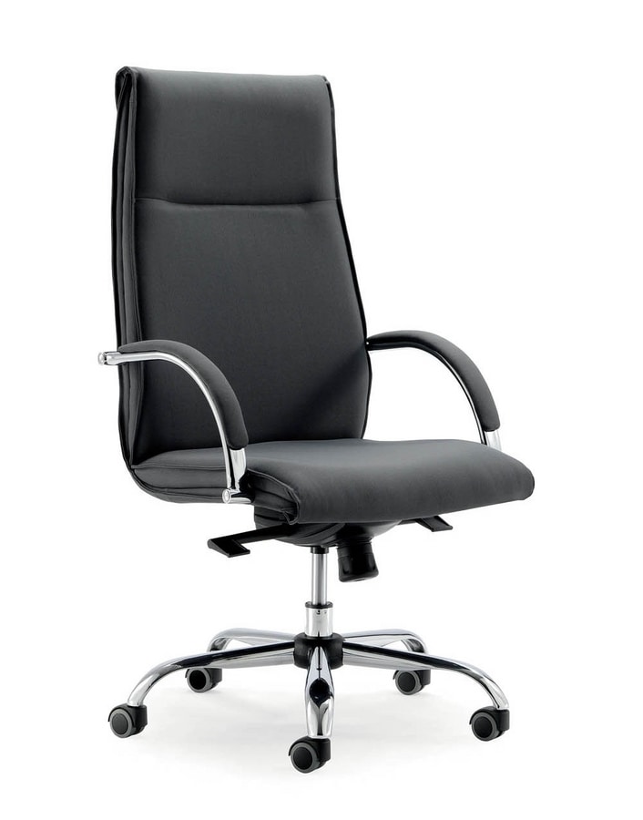 Sillón de director de la oficina. Respaldo alto. Base de Chrome con ruedas. Mecanismo de inclinación. Con los brazos cromados y cojín tapizado. Opciones de tapicería.