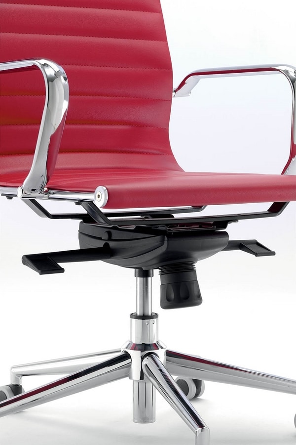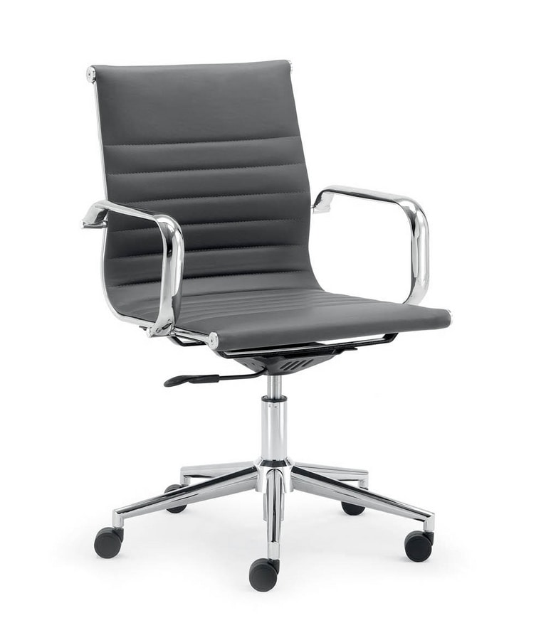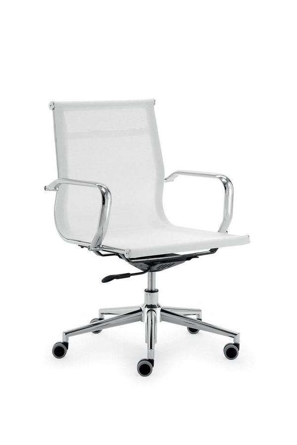 Silla de oficina ejecutiva con respaldo bajo. Disponible en versión acolchada o de malla. Apoyabrazos y base con radios metálicos.