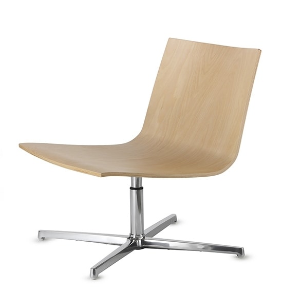 Sillas con cáscara en madera contrachapada de haya natural o con un contrapunto delantero tapizado y cubierto o tapizado completamente y cubierto. Estructuras de 4 estrellas en aluminio cepillado y pulido o en una base de metal de disco pintado o cromado, todas giratorias con retorno automático. Versiones con 4 patas en metal pintado.