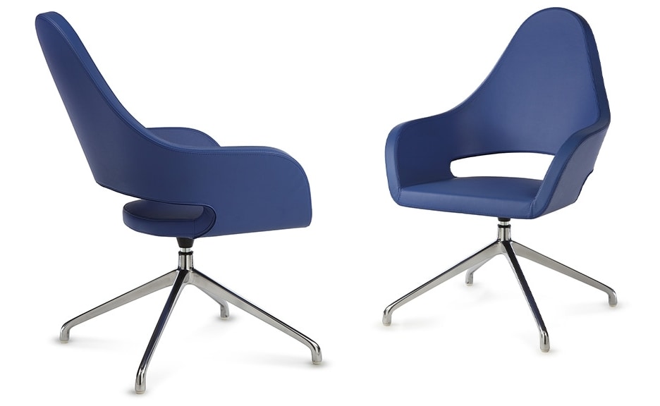 Sillas monocasco en la versión con apertura central y apoyabrazos integrados, estructuras metálicas totalmente tapizadas y cubiertas, disponibles en dos alturas.