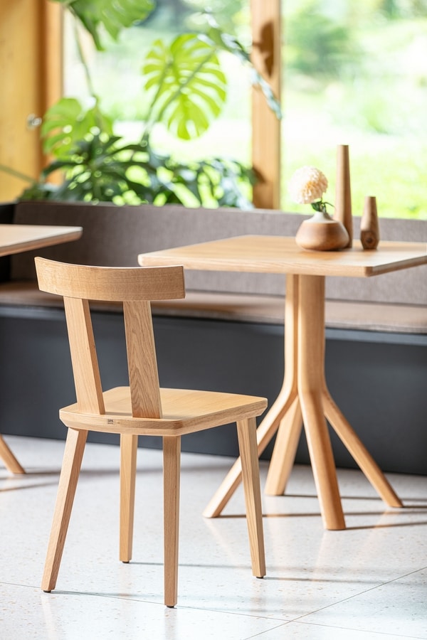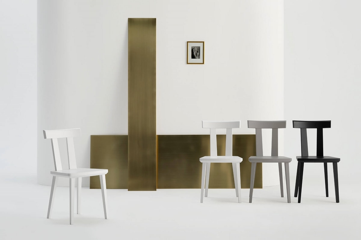 La silla Milano presenta la forma fuerte del respaldo con una fuerte presencia estética y también una función práctica, ya que permite un fácil agarre para moverla por la habitación. Milano está disponible en roble natural, con el veteado característico, en haya natural o teñido en diferentes colores. Adecuado para interiores contemporáneos, en casa o para uso contract.