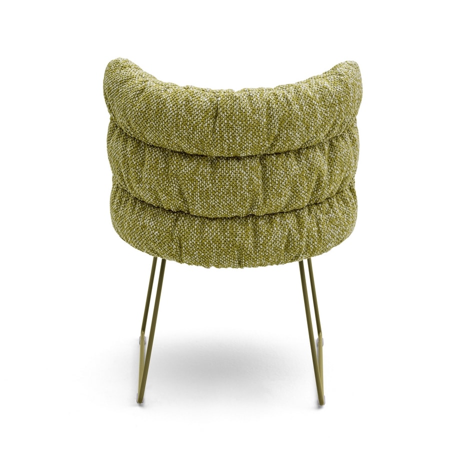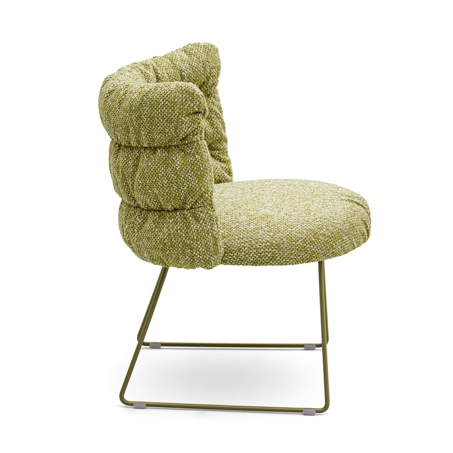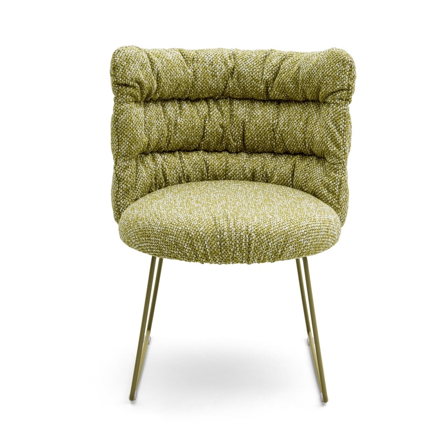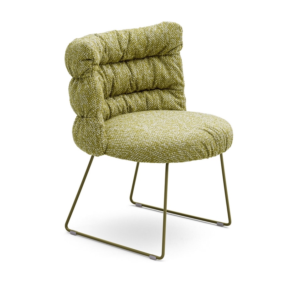 Silla con capatra de madera contrachapada, tapizada en el marco con relleno de plumas sintéticas. Asiento tapizado en el panel. Base de trineo de metal lacado.
