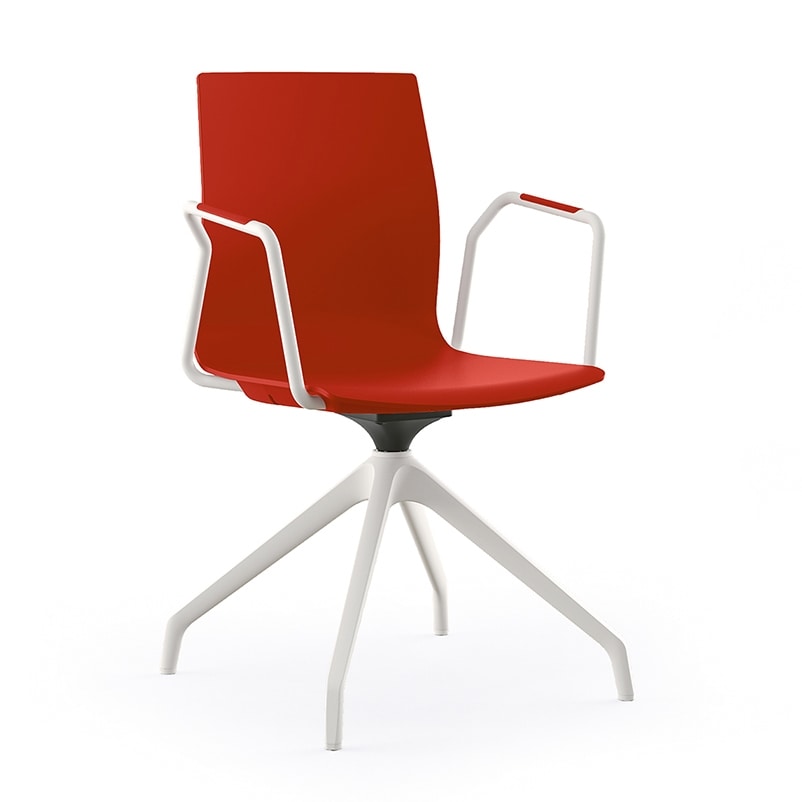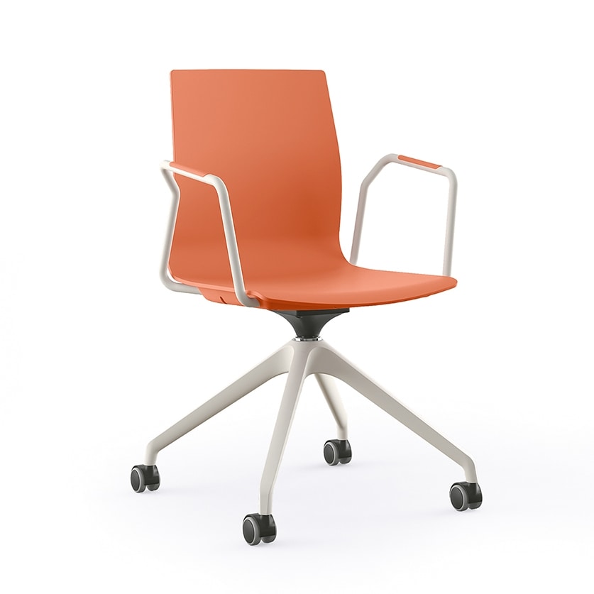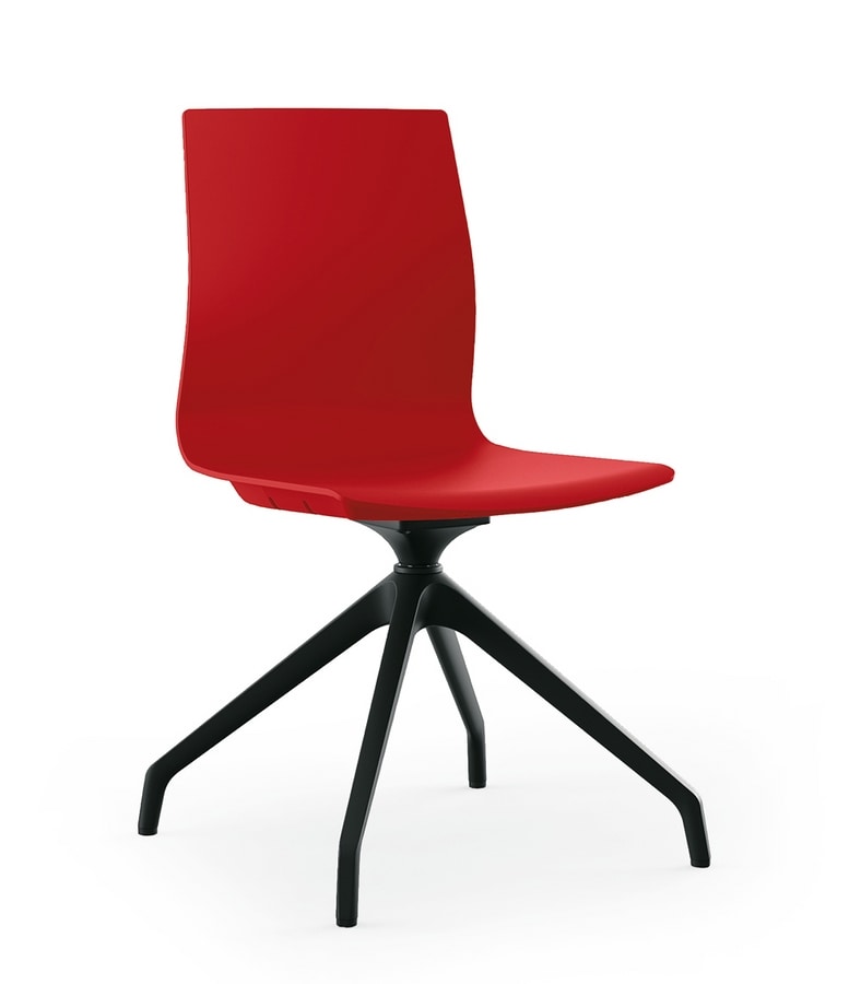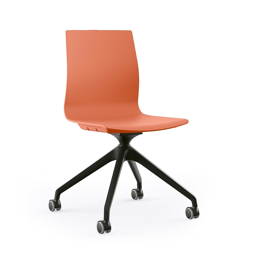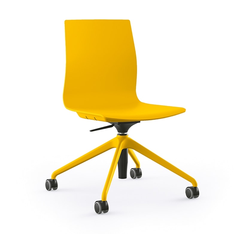 Silla giratoria con o sin brazos, con Ø 67 cm, base de nailon 4 aspas, disponible con deslizadores o ruedas (ruedas de goma con freno de Ø 50 mm para suelos duros); las bases no se pueden modificar (de deslizadores a ruedas o viceversa). Esta silla no es ajustable en altura. Acabados: todos los modelos están disponibles con acabado negro (NYN) o blanco (NYBI - RAL.9003).