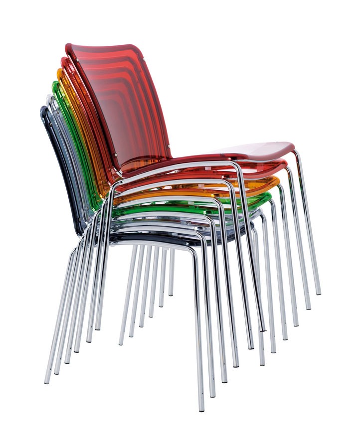 Silla apilable con estructura de acero cromado y el asiento ergonómico y de nuevo en policarbonato translúcido o en ABS brillante. Presidente de la cocina y contrato. Elegante y versátil. Diseño S. P. A.