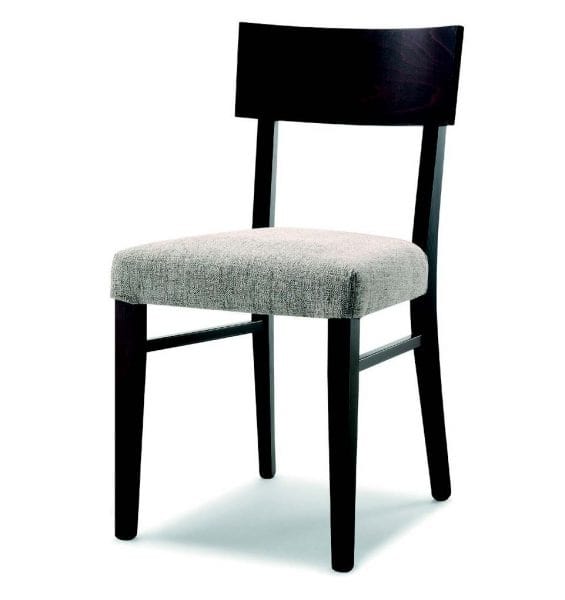 Silla en madera de haya teñida. Asiento acolchado y cubierto de tela. También disponible con asiento de madera. Un producto adecuado para el comedor o restaurantes en el hogar.