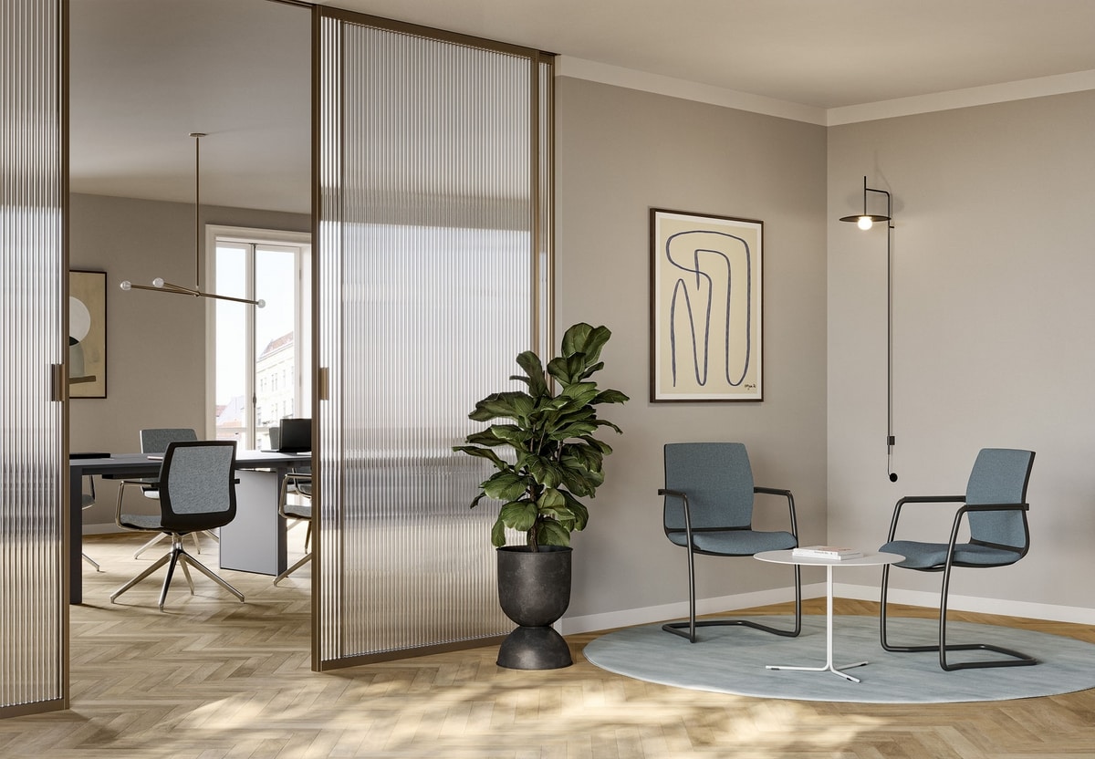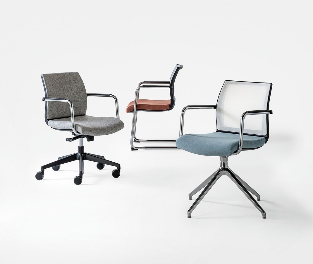 Silla de visita con asiento acolchado, respaldo en malla o tapizado, disponible en bases fijas o giratorias.