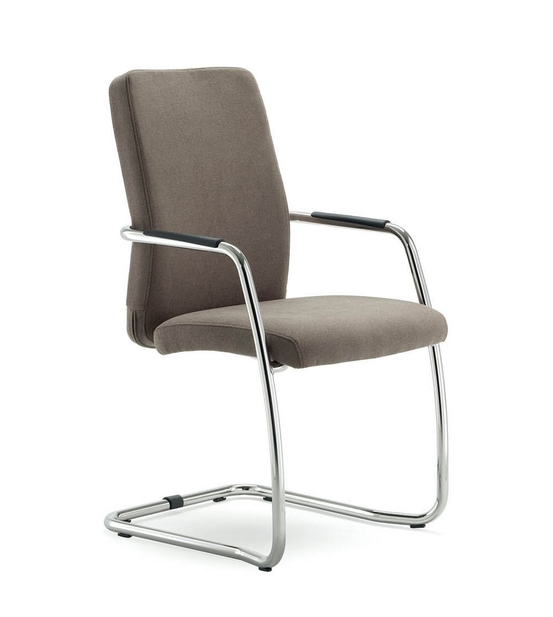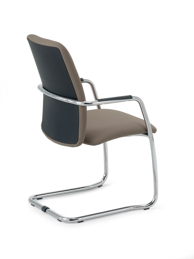 Silla tapizada con brazos y con el patín en metal cromado. Equipado con pies y espalda alta ergonómico. Disponible en diferentes colores. Apilable y versátil, hecha con costura elegante. Ideal para escritorios con un diseño moderno.