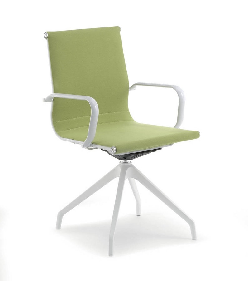 Silla con base blanca de nylon de 4 patas. Columna giratoria y placa fija pintada de negro. Estructura y brazos de acero pintado de blanco.