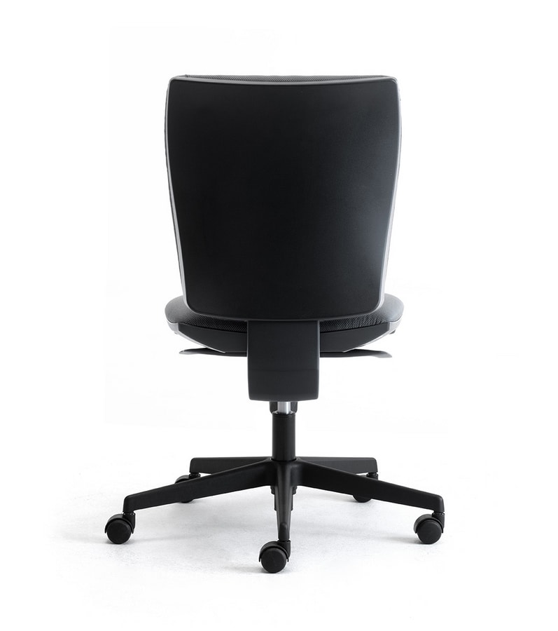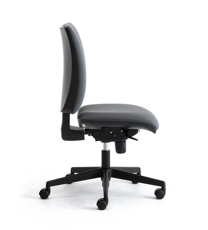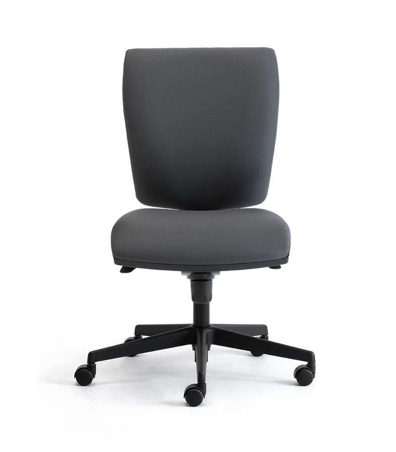 Tarea silla de oficina. El relleno es de espuma de poliuretano expandido y la cubierta pueden ser seleccionados de las colecciones de tejido disponible, la base de 5 estrellas, es de nylon negro, las ruedas son de nylon negro (tipo H), con auto-sistema de frenado, los apoyabrazos son fijos o con ajuste de altura, este modelo está disponible en la versión de trabajo con o sin brazos.