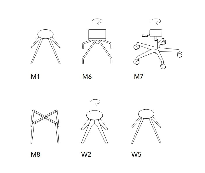 La silla Tiki está formada por una carcasa de madera revestida de caucho, con seis soluciones diferentes para la base (metal y madera, fija o giratoria).