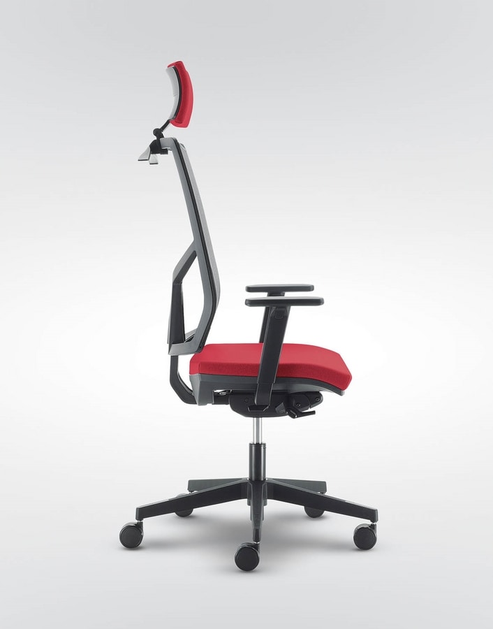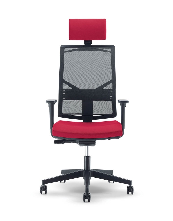 Silla de oficina moderna con brazos ajustables y ruedas giratorias. Equipado con una malla de respaldo, el asiento y el reposacabezas tapizados espumado en frío. Equipado con sincrónicamente el mecanismo de arriba y abajo. silla suave, cuadrados, líneas silenciosas, sólidas, fabricado en Italia.