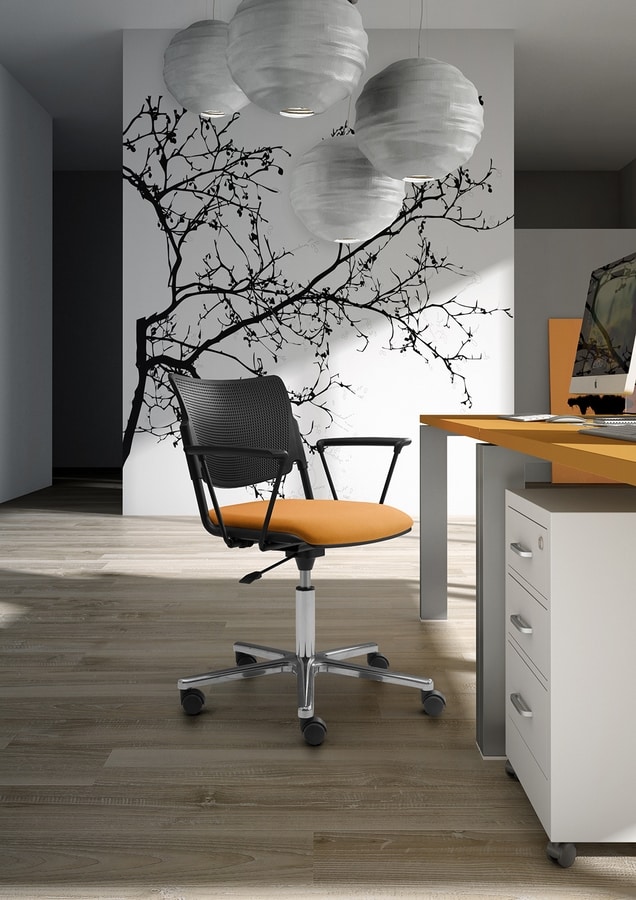 Lamia giratoria, es la versión base 5-star + ruedas de la silla diseñada por el famoso Arco. Angelo Pinaffo. Lamia se compone de un asiento de metal perforado y el respaldo (3 colores), de madera de haya natural o polipropileno anti-UV reciclables (7 colores), el cuadro es de tubo de acero en diferentes acabados como el cromo (L), epoxi negro (N), aluminio gris (GA) y negro (B), la base de 5 estrellas se encuentra disponible en aluminio pulido o nylon negro, reforzado con fibra de vidrio.