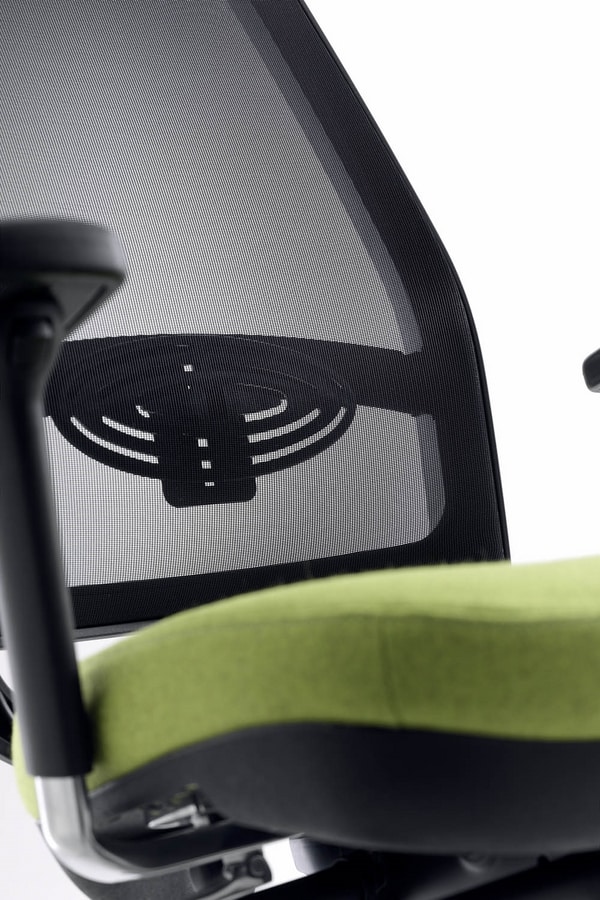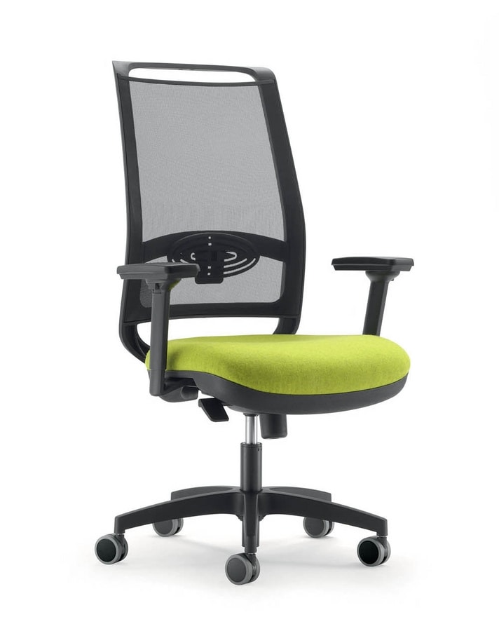 Silla operativa para oficina, con asiento acolchado y respaldo de malla. Equipado con soporte lumbar.