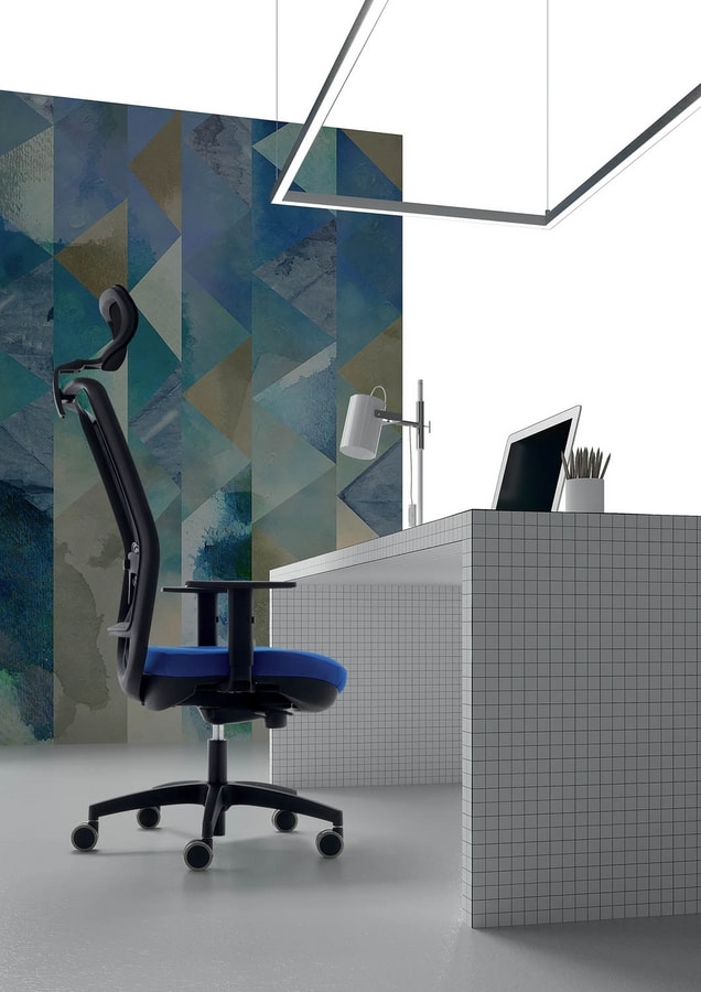 Silla operativa para oficina, con asiento acolchado y respaldo de malla. Equipado con reposacabezas.