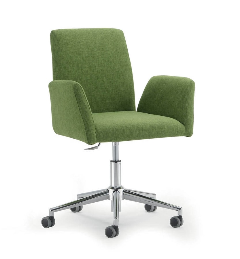 Silla acolchada con base metálica con ruedas de goma y respaldo curvo. Equipado con un mecanismo de inclinación. Disponible en varios colores. Silla cómoda y ligera para el hogar y la oficina, hecha en Italia.