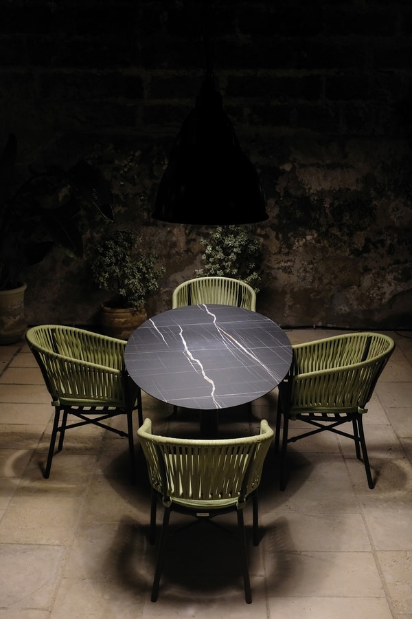 Silla en aluminio pintado antracita. Cuerda de textileno en color marrón. Cojín en tejido gris tórtola.