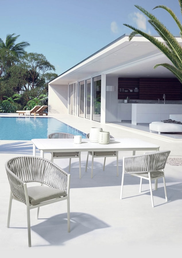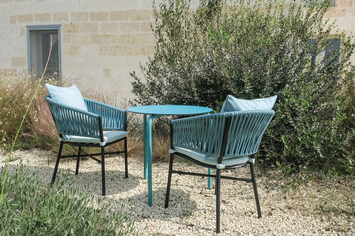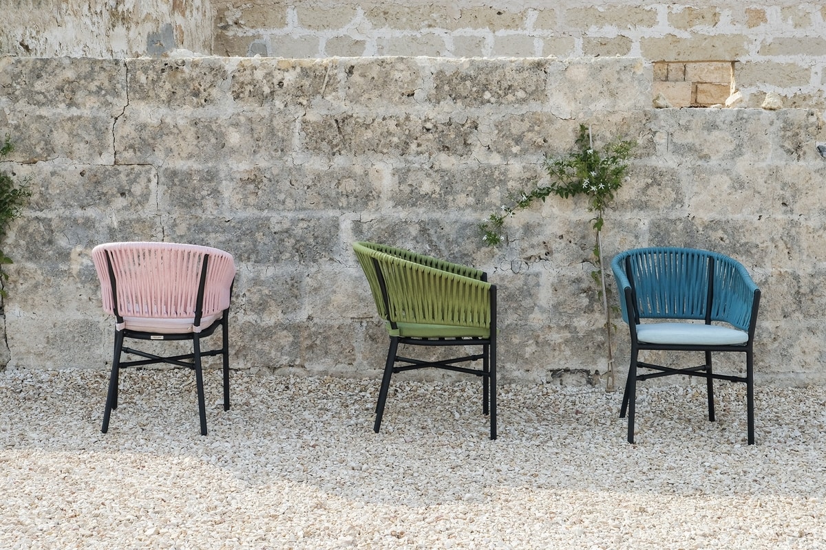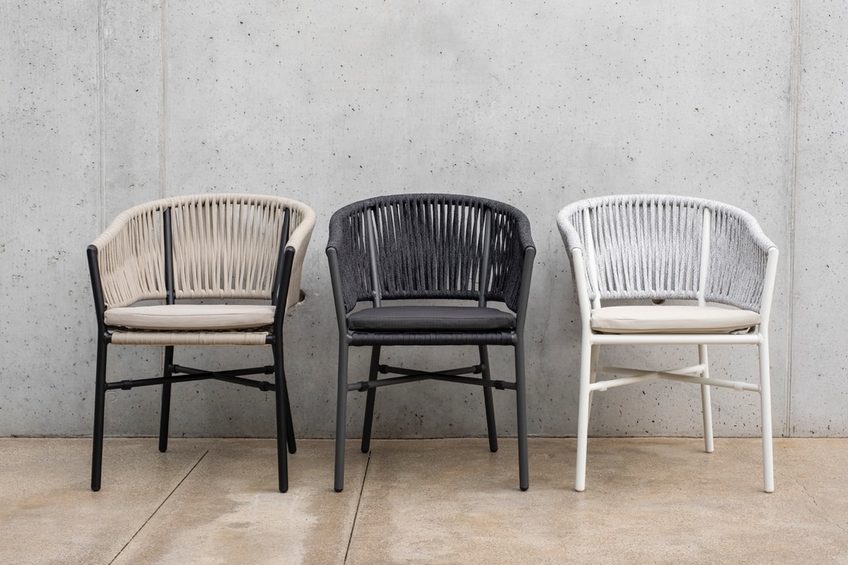 La delicada textura del respaldo es la característica clave de esta colección. Es la suavidad de la cuerda, en diálogo con las líneas del marco, lo que dota a todo el conjunto de mobiliario de una sensación de ligereza y elegancia.