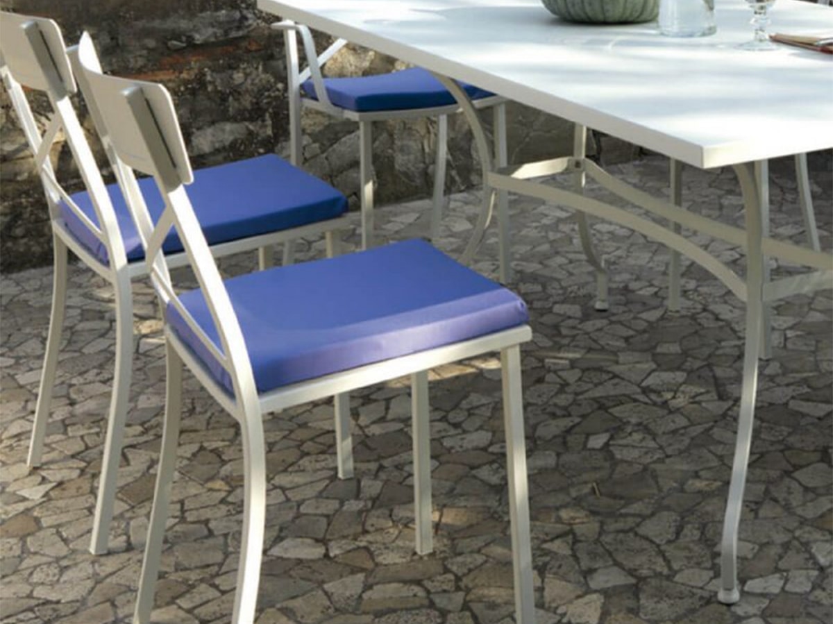 Solicitar precios Productos similaresSilla de jardín íntegramente realizada en metal, disponible en los siguientes colores: blanco gofrado, blanco perla, gris antiguo, bronce, barro y negro. Bajo pedido también está disponible un cojín de tela.