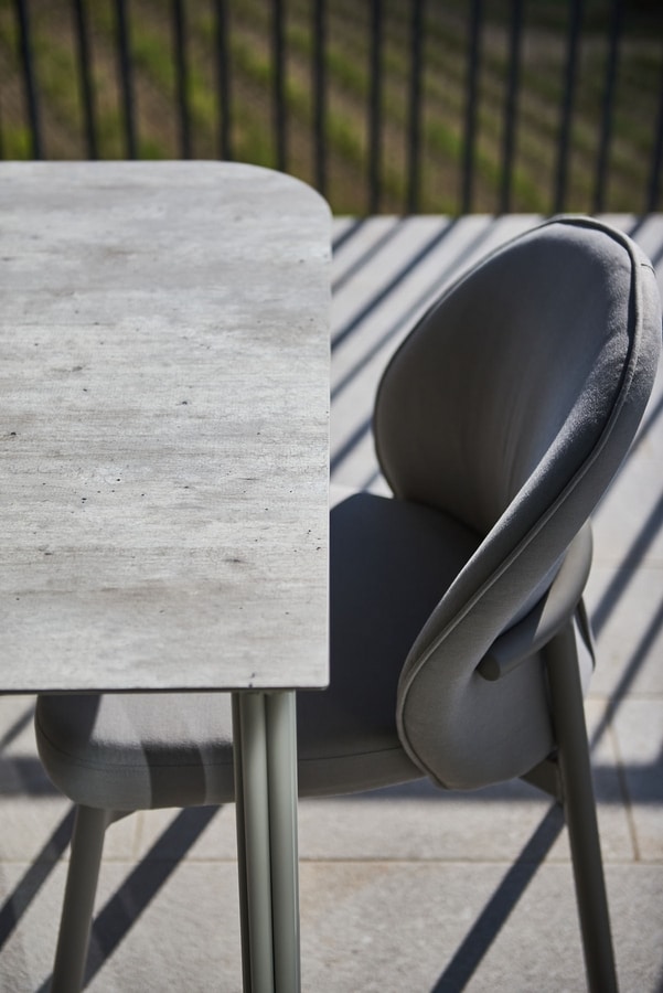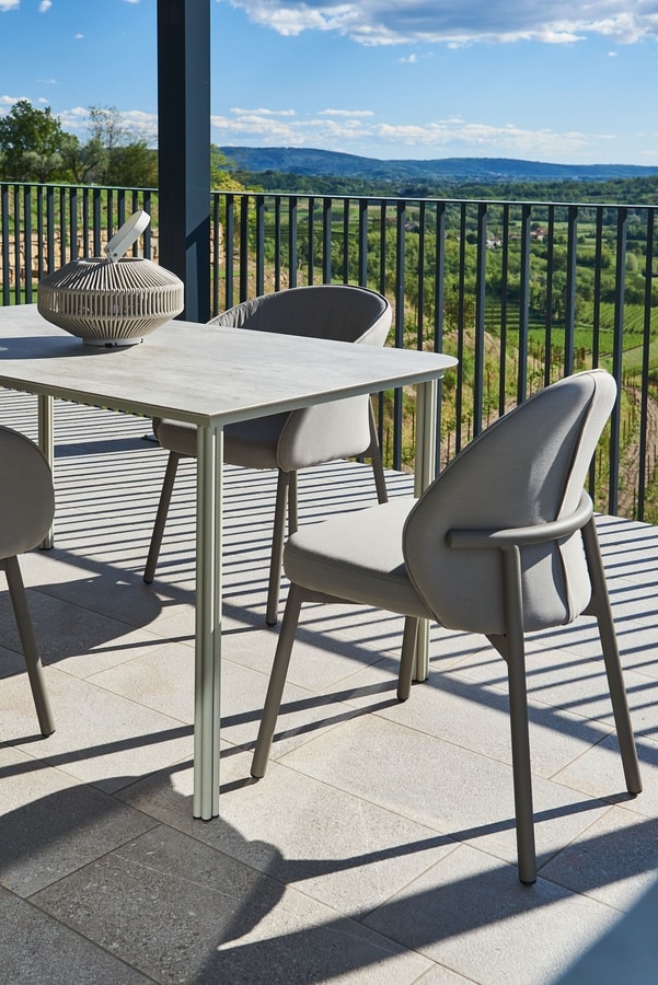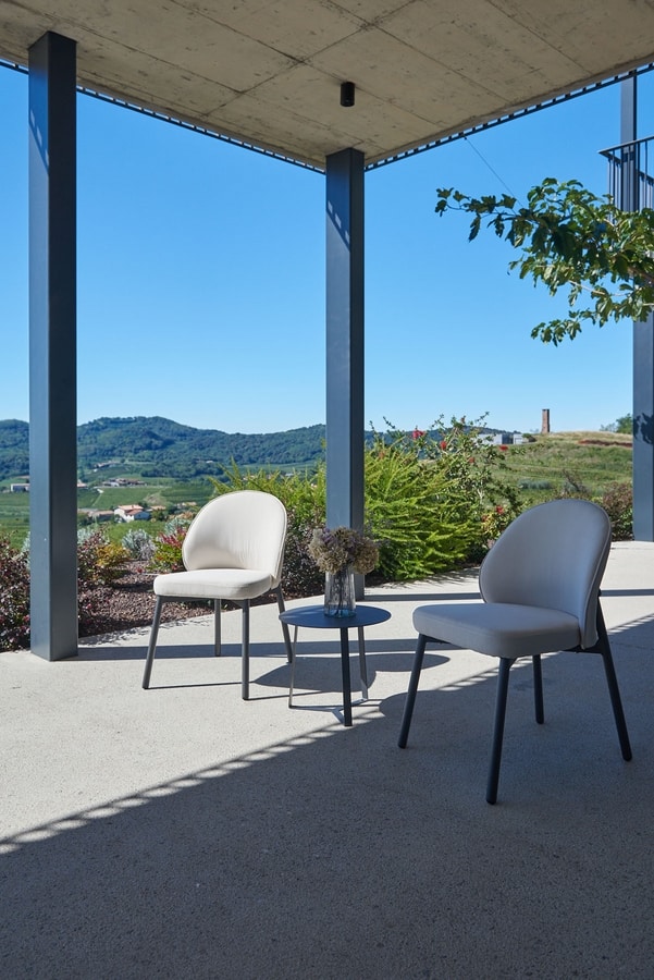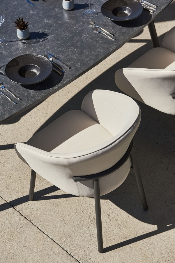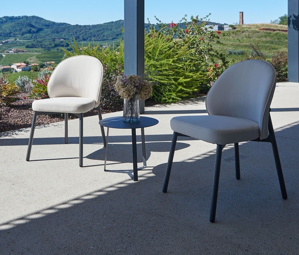 Acogedora, suave y con un sabor retro, esta silla de aluminio también está disponible en versión butaca. El revestimiento de secado rápido garantiza una resistencia total a la intemperie.