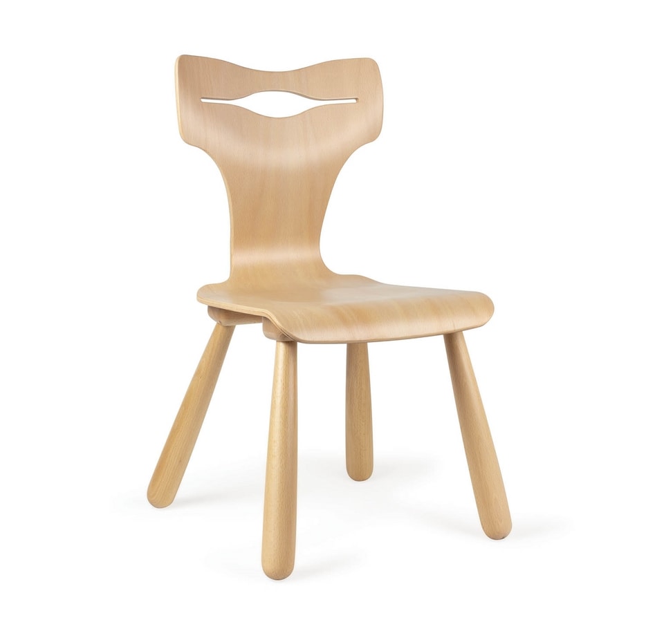 Un nuevo diseño para una silla con asiento y respaldo todos juntos en un solo molde, anatómico y confortable. La silla es de madera de haya y contrachapado de haya. Se fabrica siempre siguiendo las normas europeas en cuanto a dimensiones y seguridad.