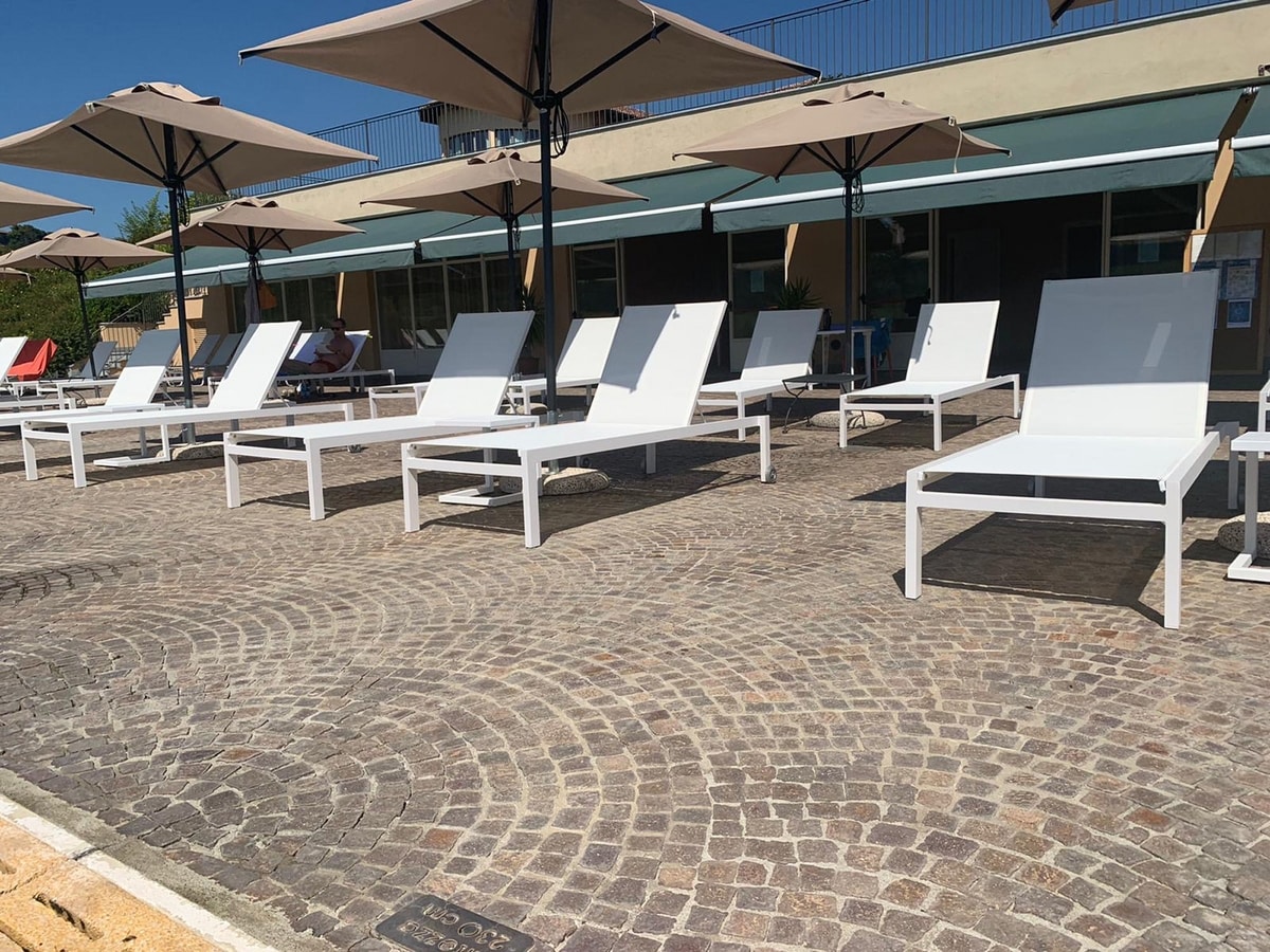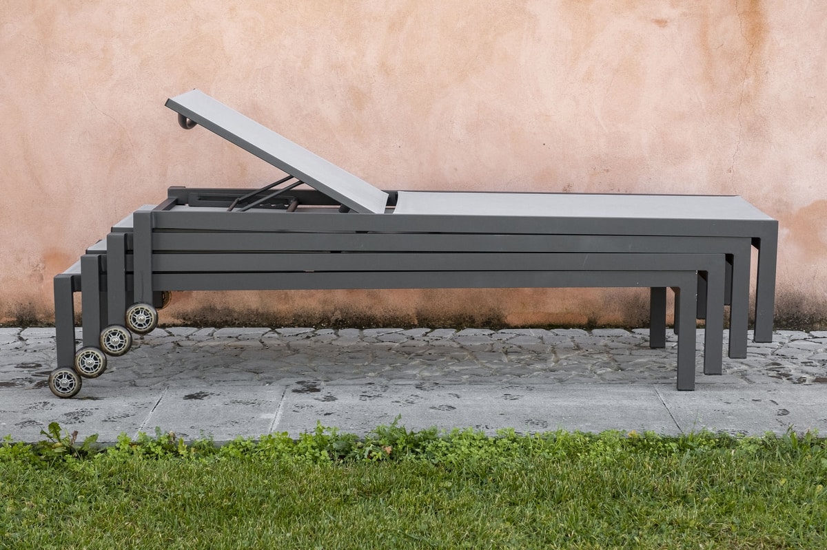 Tumbona con marco de aluminio pintado en polvo. Estructura impermeable y resistente a la luz solar (UV). Textileno exterior. Ruedas de teflón transparente. Respaldo regulable en 5 posiciones. Apilable.