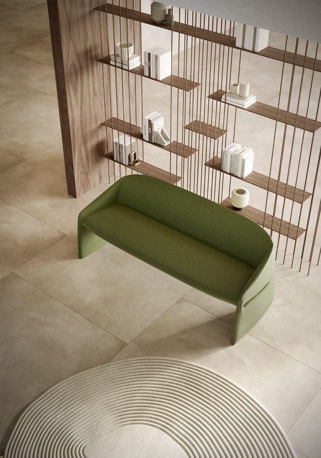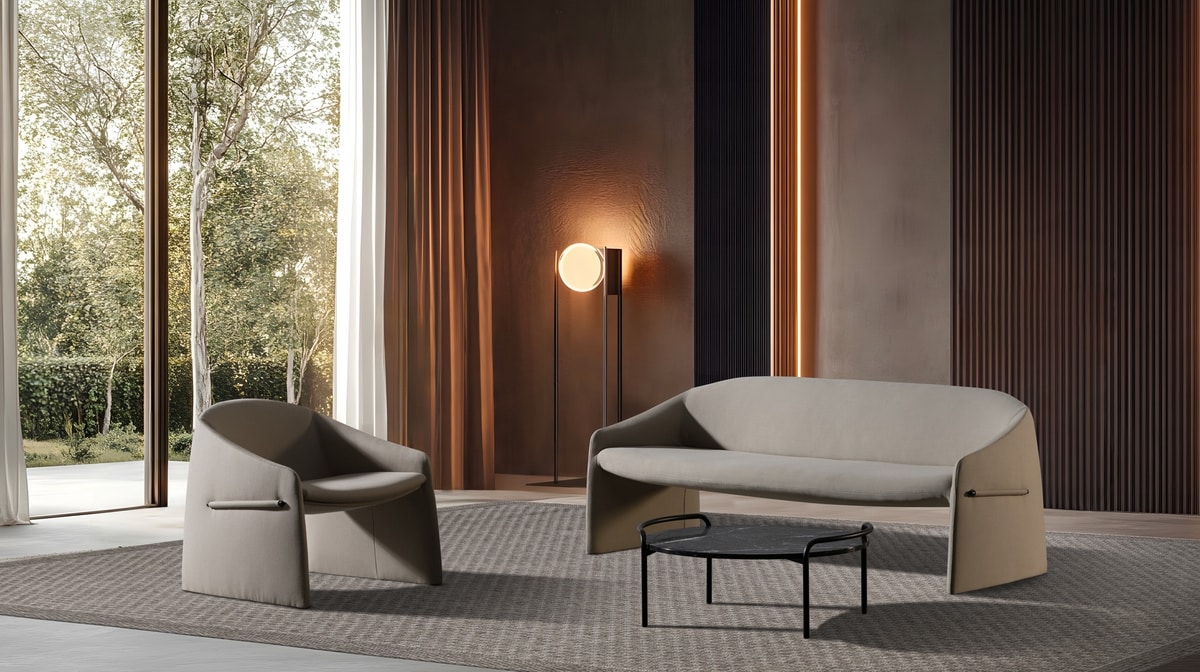 Majorette es una colección compuesta por sillón, poltrona y sofá de 3 plazas, cuyo detalle distintivo es el perfil lateral en material plástico recubierto con tejido, que atraviesa el reposabrazos como un gesto gráfico. Este elemento característico da carácter al sillón, rompiendo la continuidad del tapizado con una solución inesperada pero perfectamente equilibrada. Las geometrías que componen esta colección son compactas, elegantes y esculturales a la vez. Sus líneas fluidas y la forma acogedora crean un volumen continuo, completamente tapizado en tejido o cuero, pensado para integrarse armoniosamente en ambientes contract y domésticos.