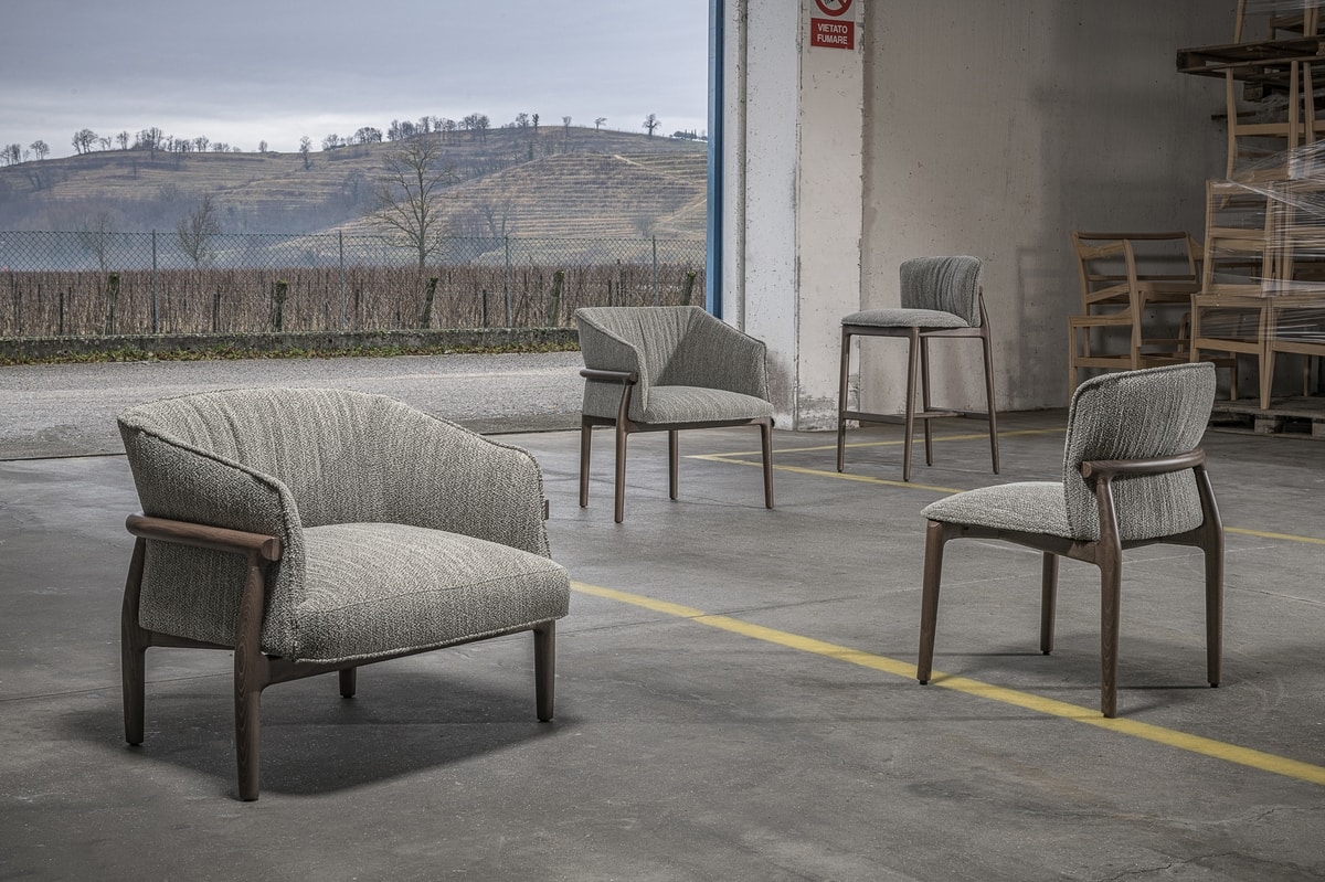 La tapicería texturizada realza la sensación de calidez y suavidad, evocando el tacto humano. La forma y el material trabajan juntos para ofrecer comodidad, primero emocional y luego ergonómica.