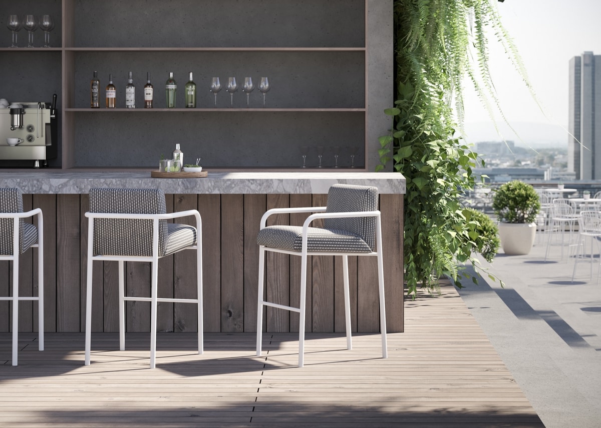 El taburete de la colección Pilar se caracteriza por un estilo contemporáneo y el máximo confort en el asiento. Sus formas elegantes son ideales para cualquier ambiente exterior, distinguiéndose con gran elegancia gracias a su diseño esencial. La estructura de aluminio garantiza estabilidad y resistencia, el cojín de tela ideal incluso para el exterior puede ser retirado, desenfundado y limpiado con facilidad.