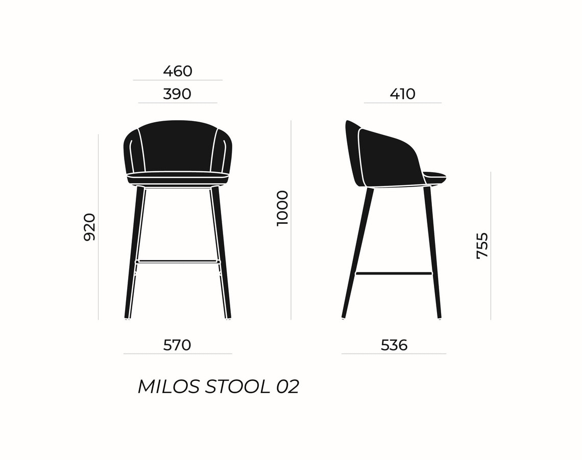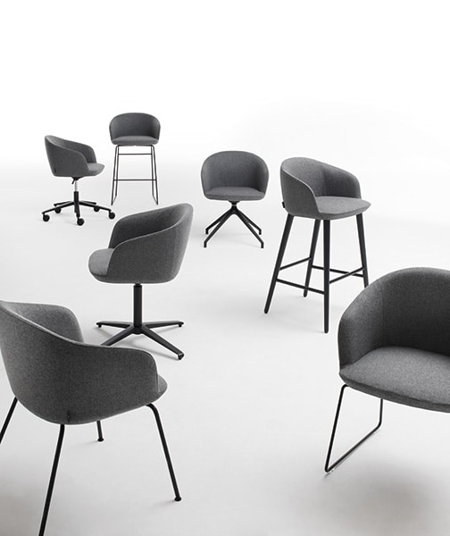 Milos es una colección de pequeños sillones y taburetes con bases de metal y madera. La integración de asientos con respaldo y reposabrazos aumenta el confort y caracteriza inequívocamente el estilo. La forma y las proporciones se realzan con tapizados monocromáticos, bicolores o bimateriales.