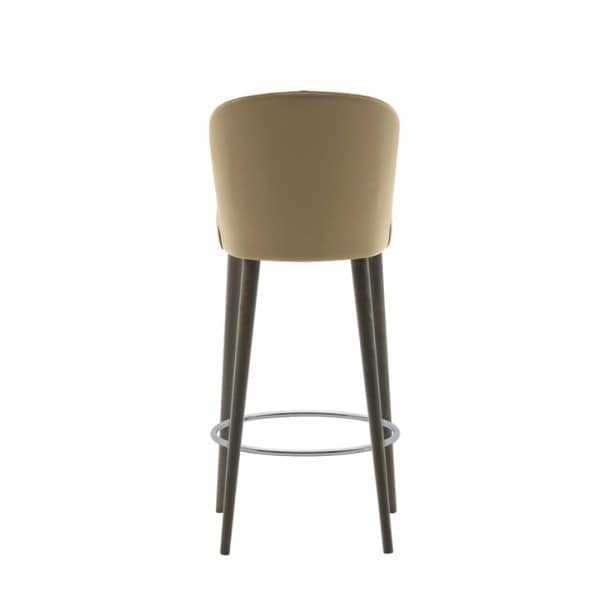 Taburete, cáscara en espuma. Asiento con cinturón. Tapizado en el marco. Con cuatro patas giradas de madera maciza y reposapiés de círculo cromado.