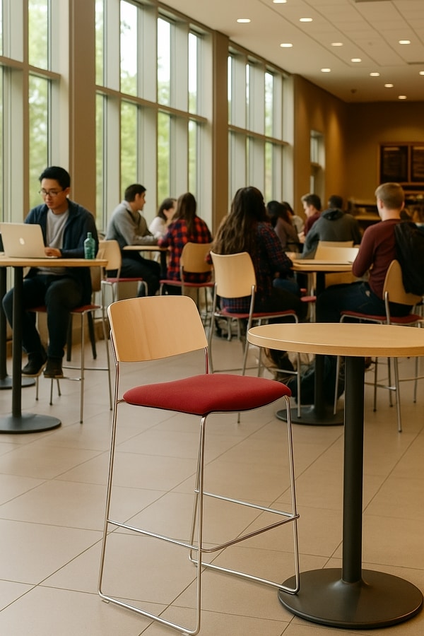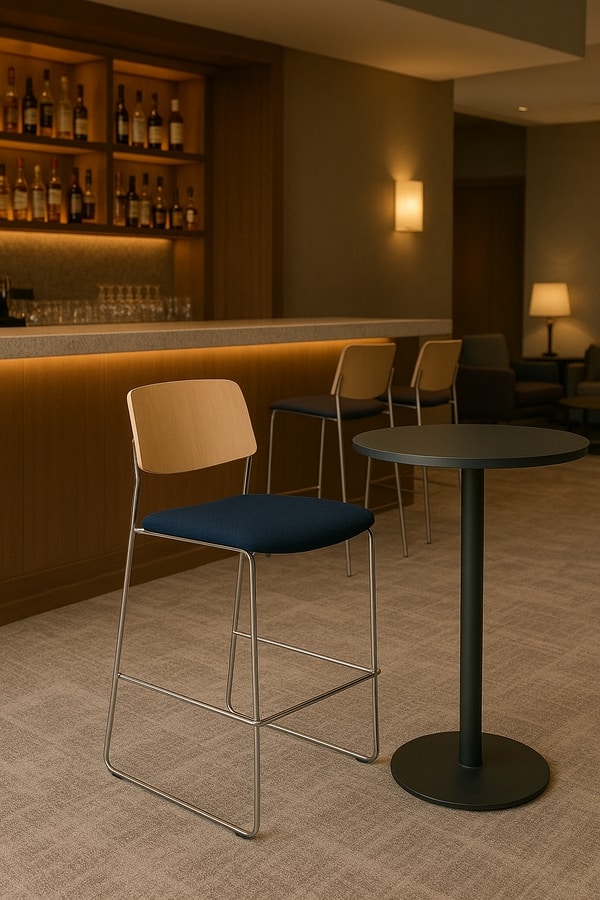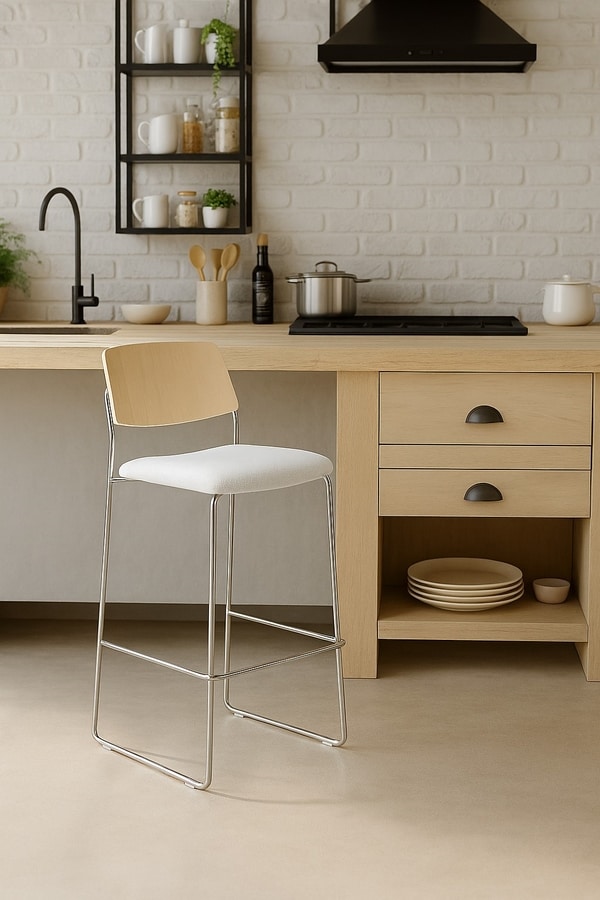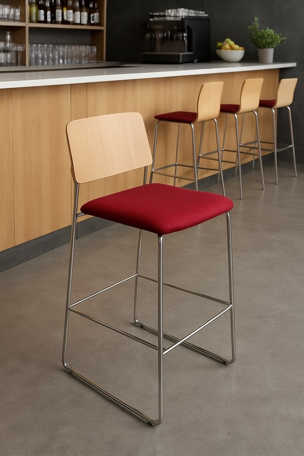 Taburete apilable con asiento y respaldo de contrachapado de haya.