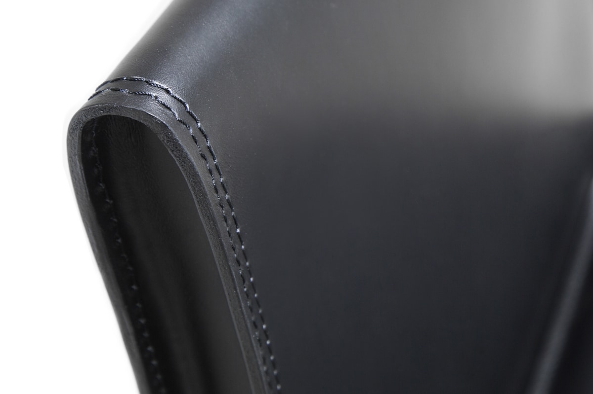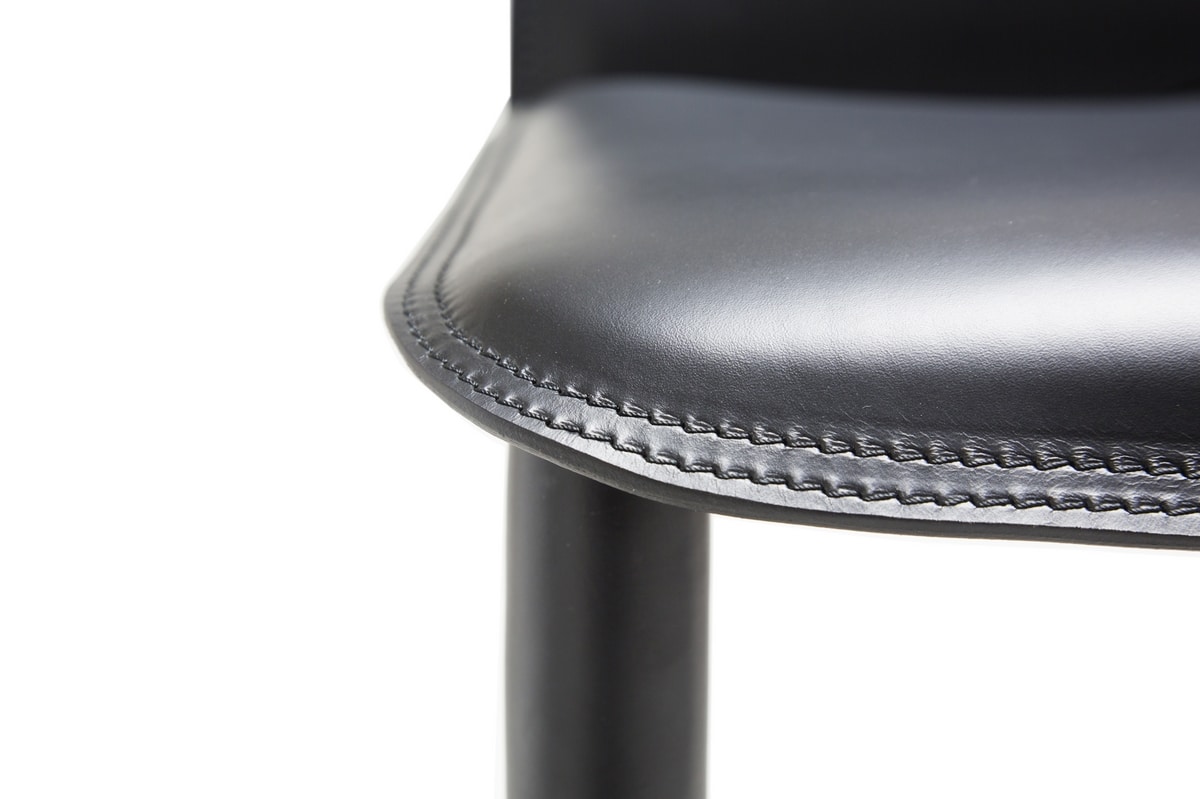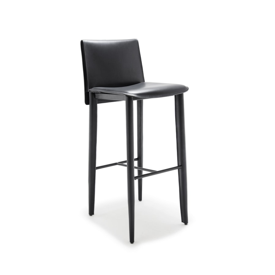 Taburete con estructura tapizada en piel plena flor. La característica elaboración del respaldo como elemento distintivo de un modelo con un estilo preciso y tranquilizador.