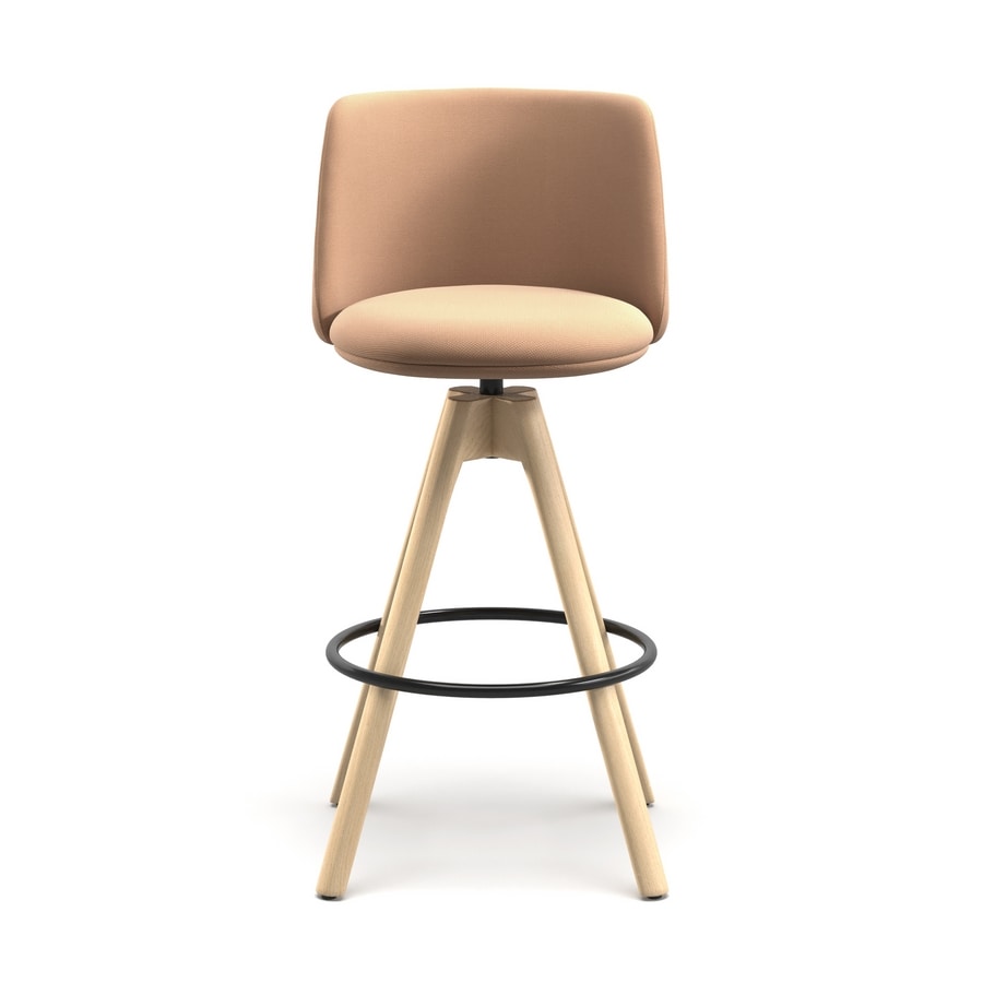 Taburete giratorio con estructura de 4 patas en fresno macizo y reposapiés de acero pintado en negro, asiento y respaldo de contrachapado de haya con espuma de poliuretano ignífuga, tapizados.