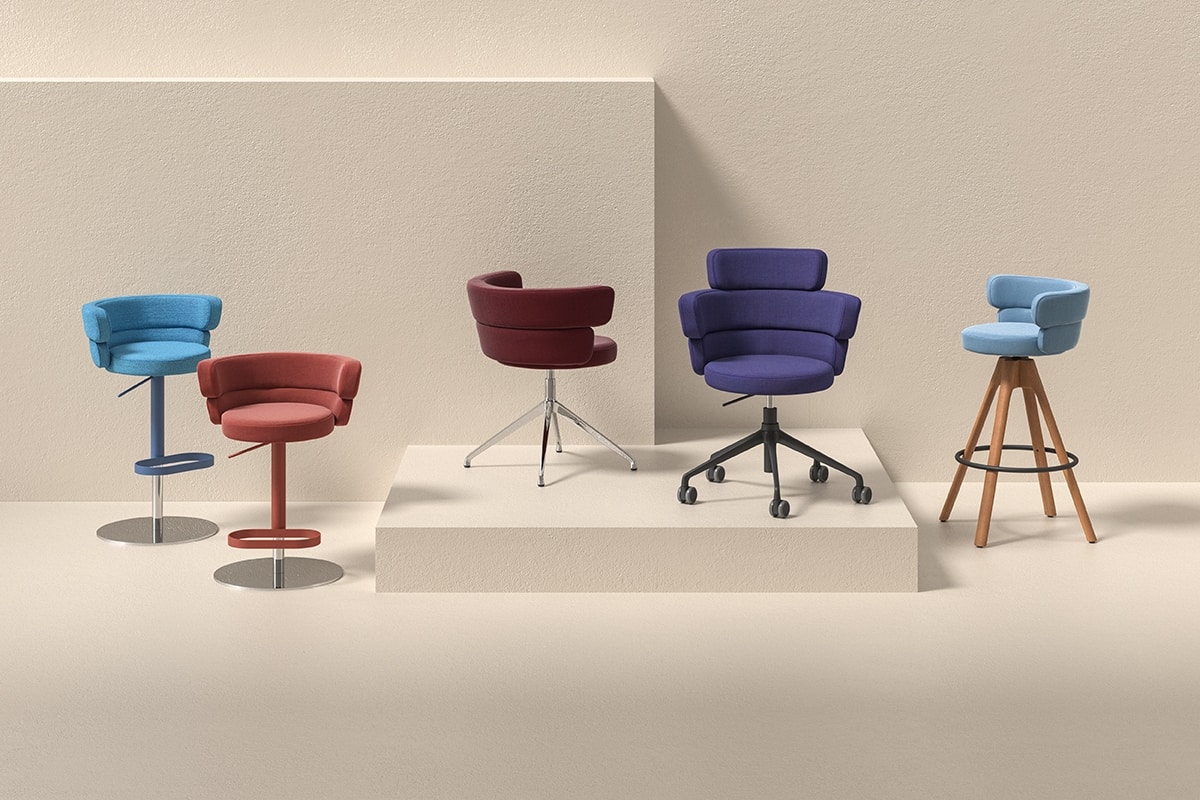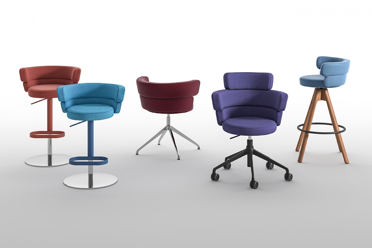 Dam es una colección de sillas tapizadas con respaldo compuesto por dos suaves bandas envolventes unidas que, además de brindar un cómodo apoyo en la zona lumbar, sirven como reposabrazos. El respaldo y el asiento redondo y generosamente acolchado están sostenidos por varios marcos de metal cromado, pulido o pintado. El sillón pequeño está disponible con o sin ruedas giratorias, mientras que el taburete giratorio de altura ajustable se suministra con un marco de acero inoxidable con acabado satinado y un reposapiés cromado o pintado. Este proyecto, que combina la estética con la funcionalidad, se adapta a todo tipo de ambientes, desde el interior del hogar hasta el público.