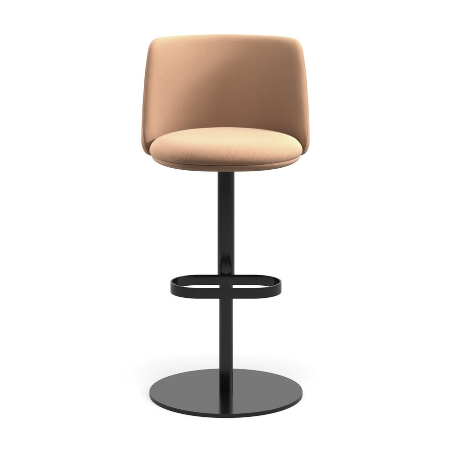 Taburete giratorio y autoalineable. Estructura monocromática cromada o pintada. Base de acero Ø450 mm. Asiento y respaldo de contrachapado de haya con espuma de poliuretano ignífuga, tapizados.