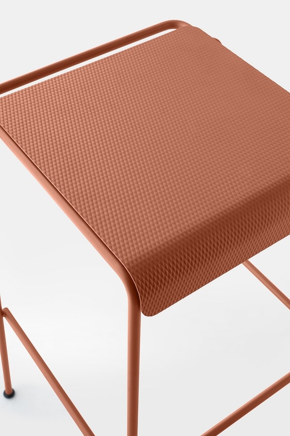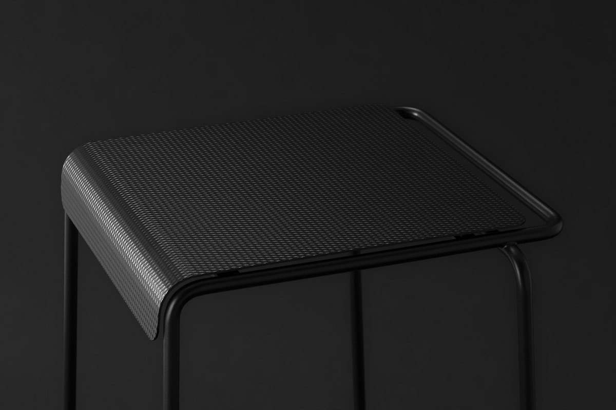 El asiento, fabricado en chapa de acero inoxidable texturizada y pintada, sorprende por su acabado similar a la tela: una invitación táctil y visual a sentarse, tocar y descubrir.
