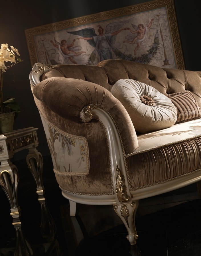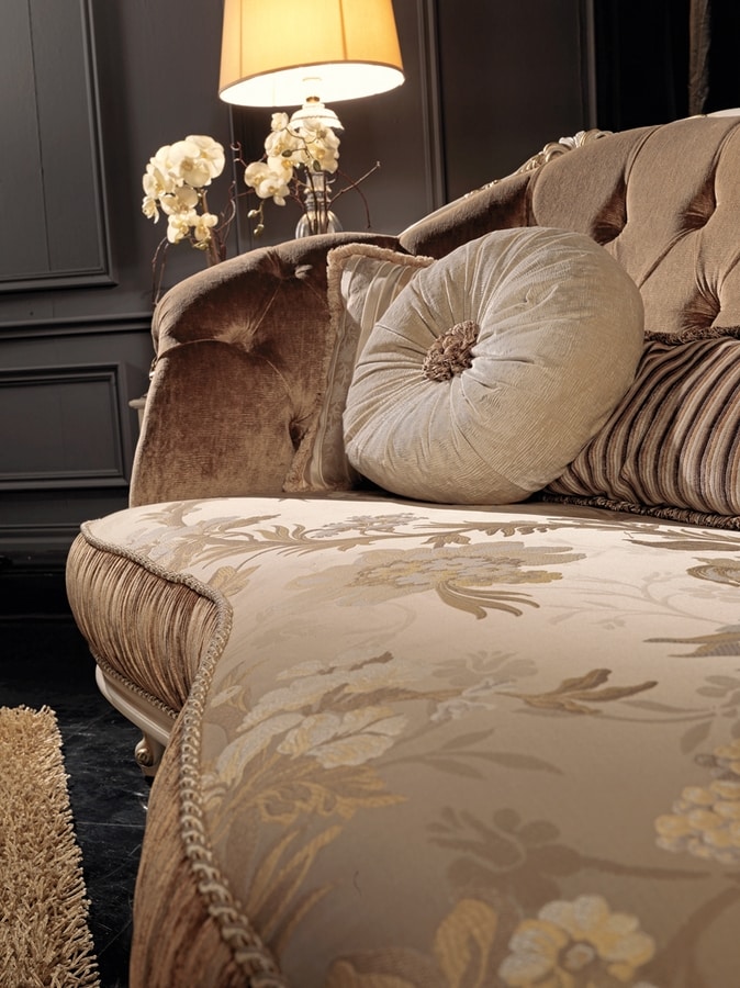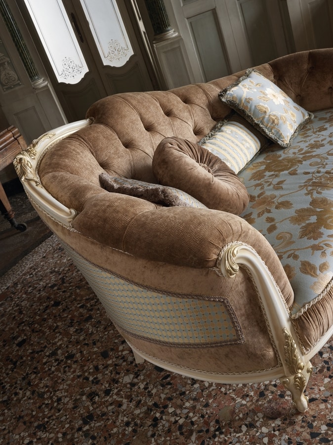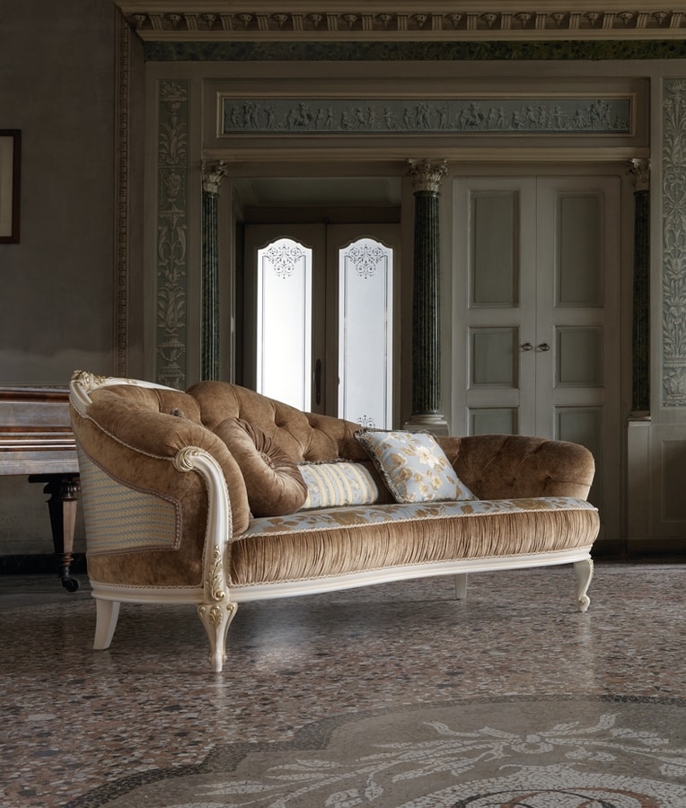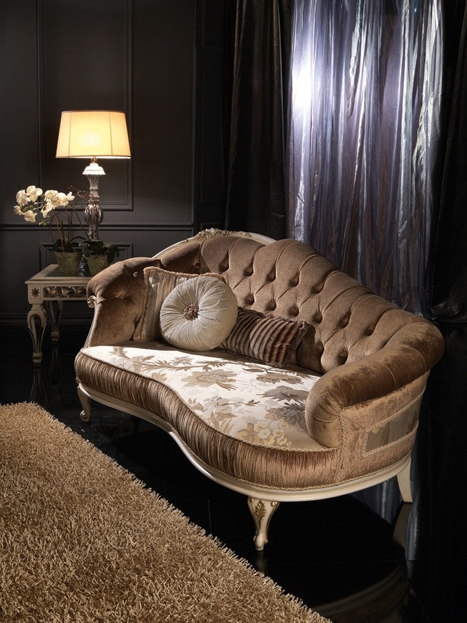 Dormeuse clásico con marco de madera, acabado lacado en blanco patinado con detalles de plata y la tapicería de tela. Dormeuse clásico disponible en versiones de izquierda o derecha. cm 192x100x94h.