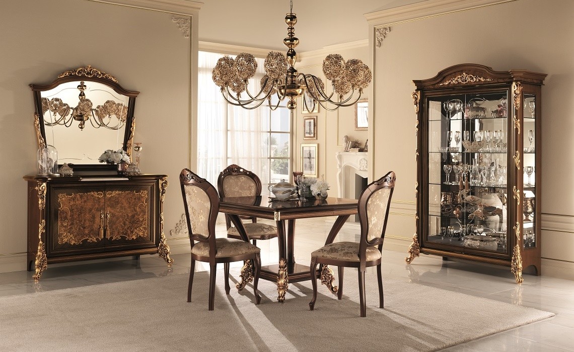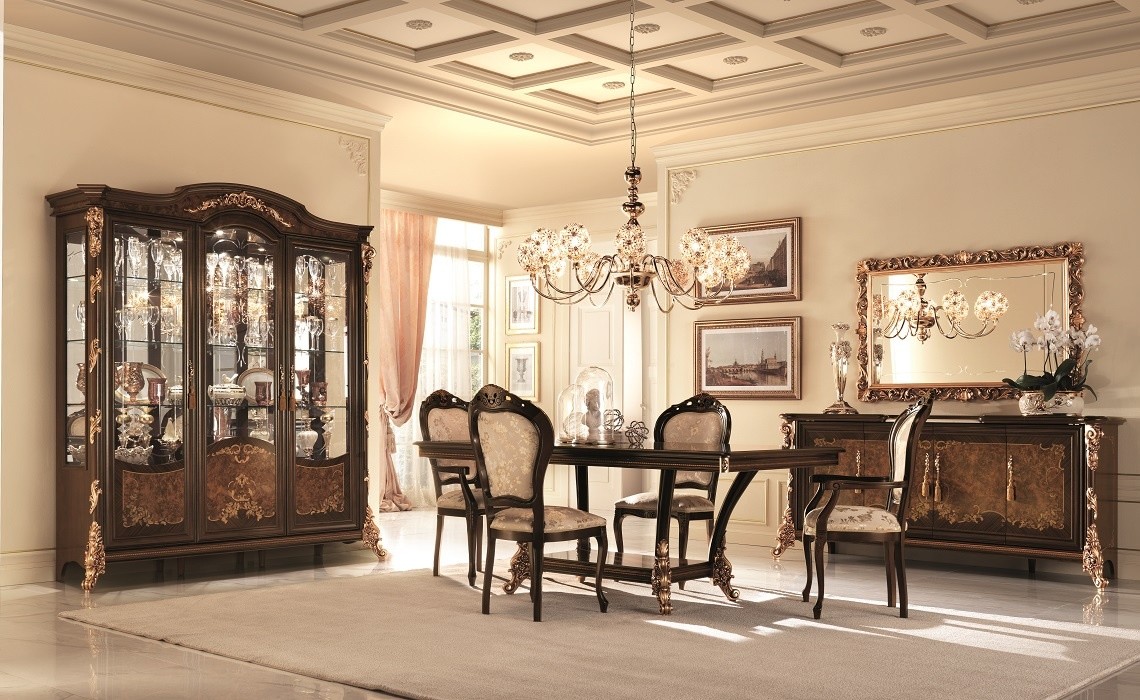 El comedor colección Sinfonia está impregnada de un dinamismo elegante. Cada elemento de mobiliario es una creación diseñada para expresar el valor de diseño clásico italiano que culmina de forma decorativa con el barroco. En un homenaje a la fusión teatral del siglo XVII forma y el color, la edad de oro de la tradición decorativa italiana, la mesa soporta, molduras de puertas de espejo y complementarias están adornados con el dorado de flores y volutas sinuosas. estilo de clase atemporal.