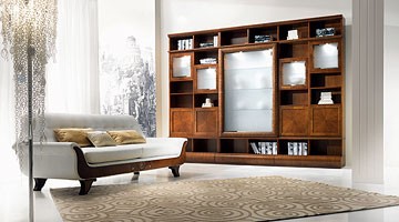 Solicitar precios Productos similaresPois nuez de vidrio de gabinete modular estantería con estructura escultórica. La parte superior tiene una cubierta curva zebrano. Los frentes de los cajones en la parte inferior y las puertas inferiores son también de zebrano con punta de diamante del panel decorado. La puerta del centro de deslizamiento del elemento principal (VL27 / A cm 230x55x260 h) se afila con un trabajo exquisito alivio zebrano en una base de madera maciza, hecho a mano e iluminados por la madre-de-perla puntos. Las puertas superiores se hacen de madera de nogal, con orlas y estrellas que se encuentra en la madera sólida. Dentro de luces si se solicita. Con compartimento secreto. Piezas adicionales disponibles, que también pueden ser utilizados individualmente (VL27 / C cm 58x55x260 h).